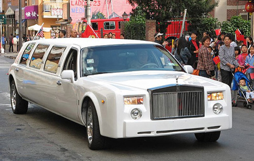 劳斯莱斯超长版在美国费城唐人街(劳斯莱斯很名贵产量很少,超长版更是稀少。)