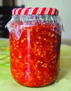 做法:新鲜的朝天椒,配几只红尖椒(爱吃辣的人可以全用朝天椒),500克番茄,一块姜,两头大蒜。以上各样分别放搅拌机搅成糊状。炒锅放水一小碗,用中火煮,各种糊下锅中,熬酱(蒜蓉留一半最后放),边熬边加盐、糖(少许)、米醋小半瓶。切记要不停地用勺搅拌以防粘锅,由稀转稠就可以关火了,然后下点味精,再把剩下的蒜蓉倒进去,凉后装瓶。