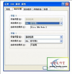2.在IDE通道属性窗口中选择“高级设置”标签,这时您就能清楚的知道您的DVD刻录机工作在何种模式下了(ND-3550工作在UltraDMAMode2模式,也就是DMA33模式,(DMA33模式DMA显示为2,DMA66为4,DMA100为5、DMA133为6))。如图1所示。