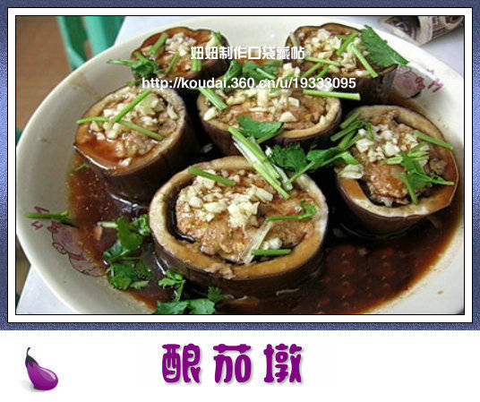 制作: 1)茄子去蒂洗净去皮,切成3厘米长的圆段,用小刀挖去茄子段中间部分。 2)把肉馅加葱末,姜末,盐,味精,鸡蛋搅均匀后,抹入挖空的茄墩内,撒上火腿末,香菇末,香菜末,上屉蒸8分钟,熟后取出,摆入盘内。 3)勺内放少许底油,加汤,盐,味精,烧开用湿淀粉勾成流芡,浇淋在茄墩上即好。