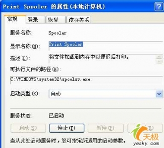 其次在该管理窗口的左侧列表中,依次选中“服务和应用程序”/“服务”选项,在对应“服务”选项的右侧列表中,用鼠标双击“PrintSpooler”服务,打开如图2所示的服务属性界面,单击该界面“常规”标签页面中的“启动”按钮,将“PrintSpooler”服务重新启动起来;不过需要提醒各位注意的是,一旦“RemoteProcedureCall”系统服务没有正常启动的话,我们还应该先将它启动起来,否则“PrintSpooler”系统服务是不能被成功启用的;