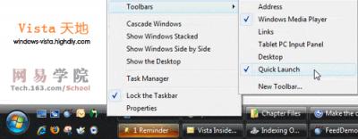 如果在WindowsVista的任务栏中没有看到快速启动工具栏,只需右键单击任务栏中的任意空白区域,在弹出菜单中选择工具栏(Toolbars),然后单击“快速启动(QuickLaunch)”即可。